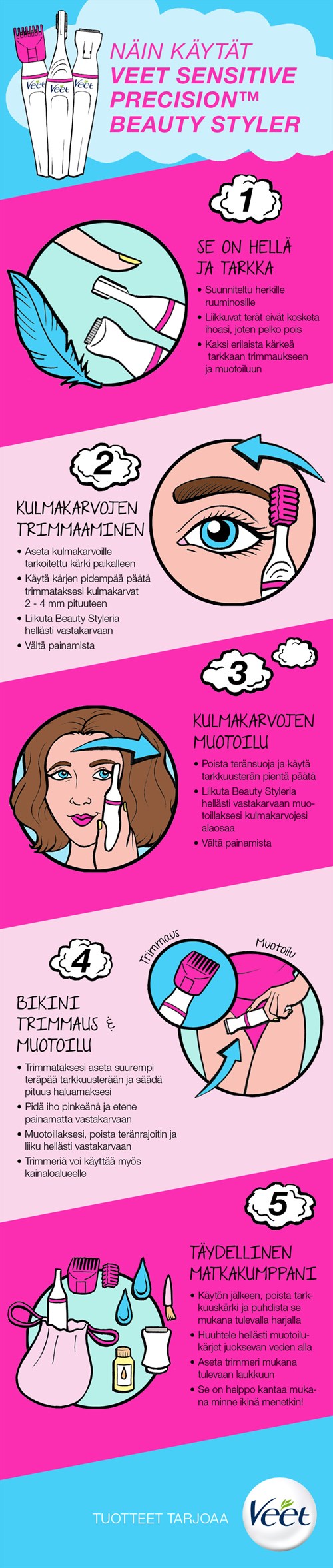 Veet Sensitive Precision Beauty Styler poistaa ei-toivotut karvat ilman haavaumien riskiä.Trimmerin mukana olevien tarvikkeiden avulla tarkka muotoilu onnistuu helposti. Sähkökäyttöinen trimmeri sopii hyvin myös kiireiseen viimeistelyyn sekä matkalle mukaan otettavaksi.